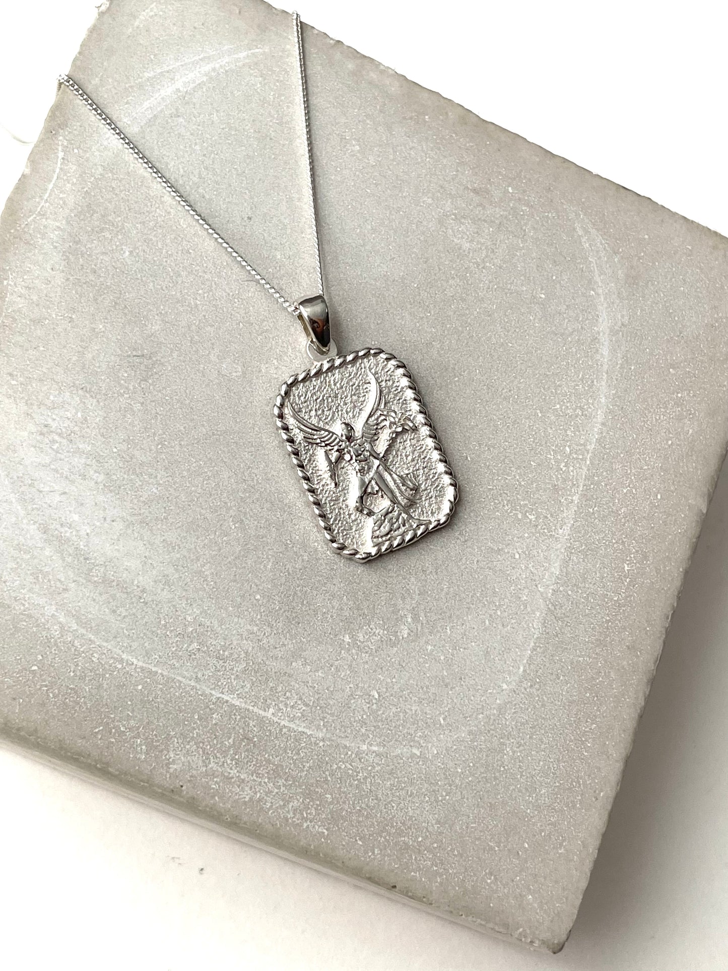 These pendants were finely crafted entirely in Canada. Designed and exclusively Made for Q&C, we are now proudly the only home of our archangel series.This new spin on an age-old design is timeless enough to protect your spirituality and style for years to come. The fine rope details and textured surface provide just enough refinement to this rectangular pendant.