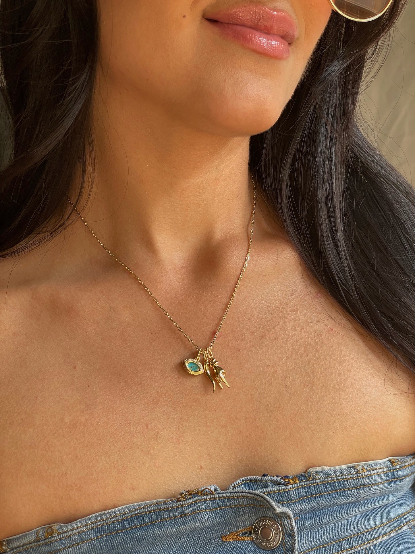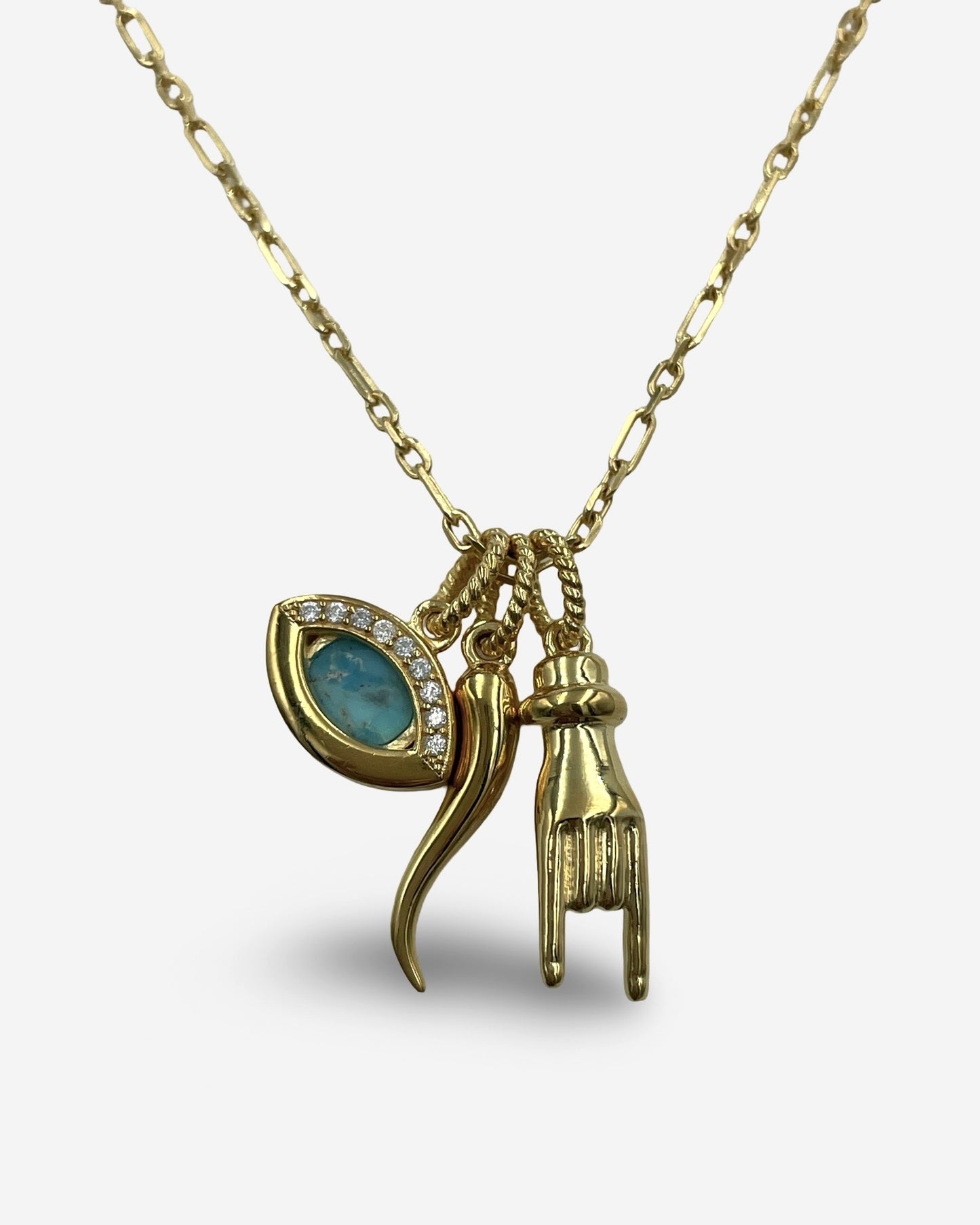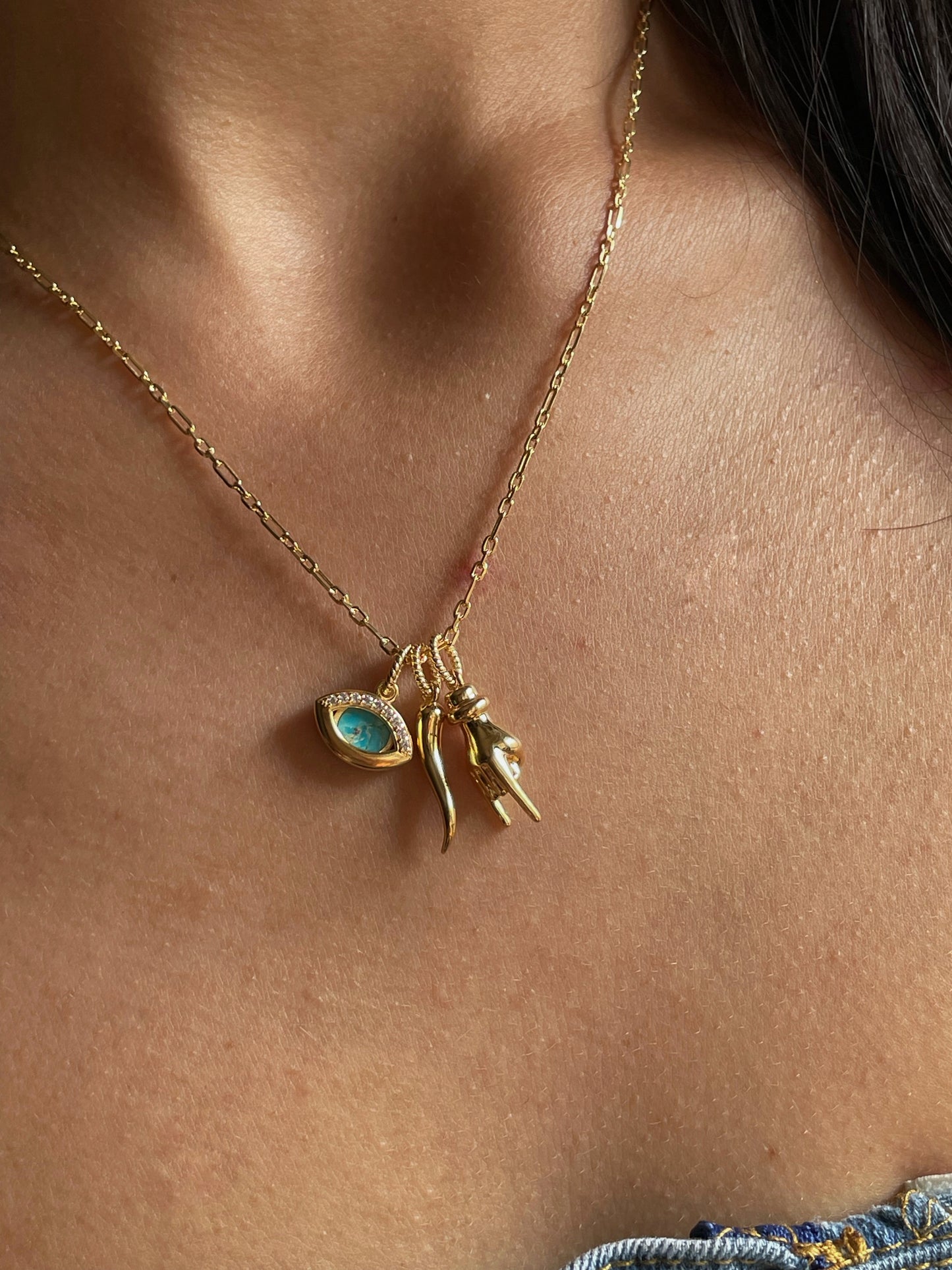 A unique square link chain, with the highly protective Corno, Mano Cornuta and Evil eye charms are included in this piece for triple protection. A European classic inspired by our Founders, Nonna - this is triple protection with an absolute twist.