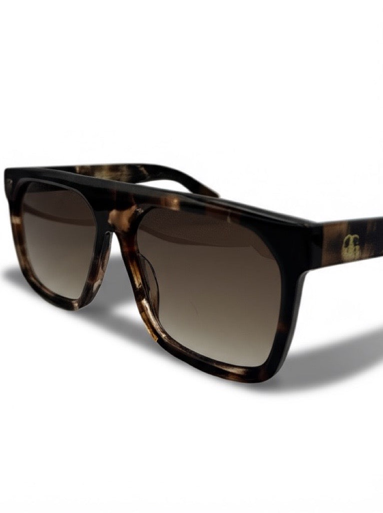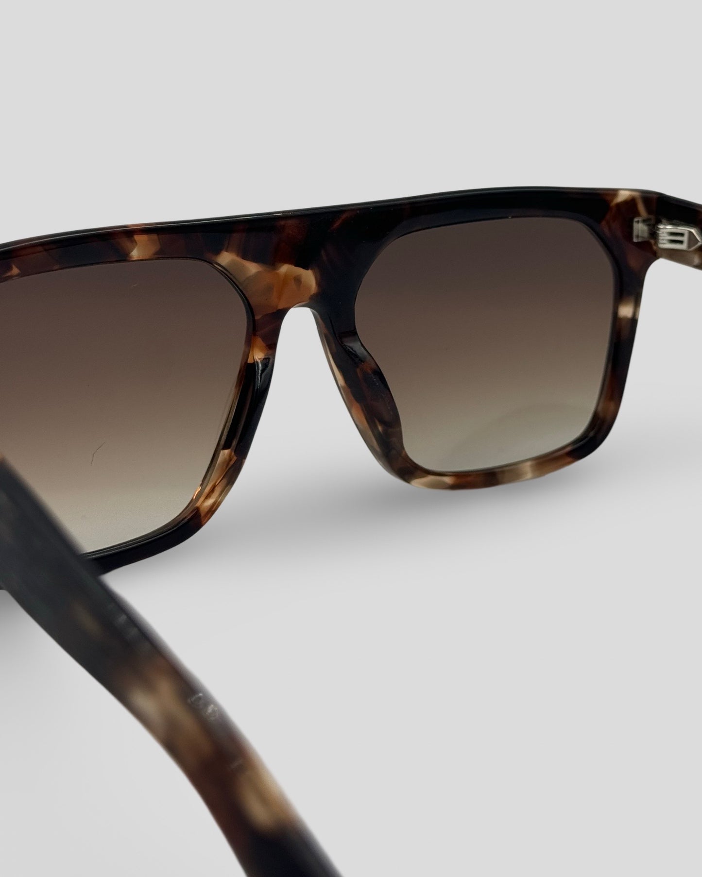 Brown Acetate Frame - thick frame, brown gradient lens. Matte exterior frame on arm of sunglasses.